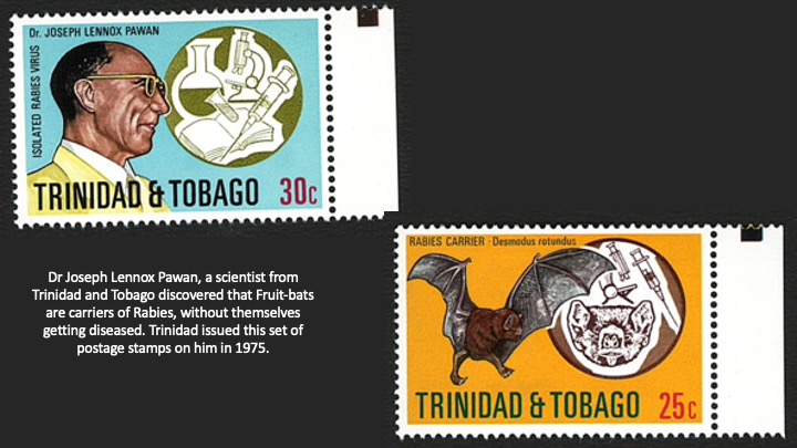 Many animals that carry rabies virus are not furious or infected themselves. In 1937, a scientist in Trinidad and Tobago, discovered that fruit-bats also carry rabies virus, without themselves becoming infected. This finding by Joseph Lennox Pawan, was initially met with skepticism. In-fact rabid dogs, monkeys, rabbits, and cats die early after getting infected. Bats can survive the virus for months, without any unusual behaviour.