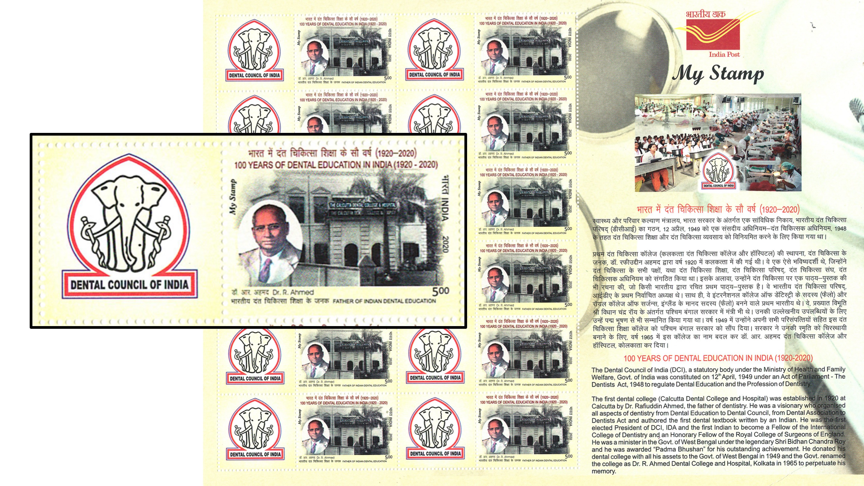 In India, Dr Rafiuddin Ahmed established first Dental college in Calcutta in 1920. He had returned back to India in 1919, after studying dentistry in the United States. The first dental college was a privately funded institute. Dr Ahmed also established first Dental journal, and founded Dental Council of India. In 1949, he donated his college to the government of West Bengal. In 2020, India-post released a “my-stamp” postage in his honour.
